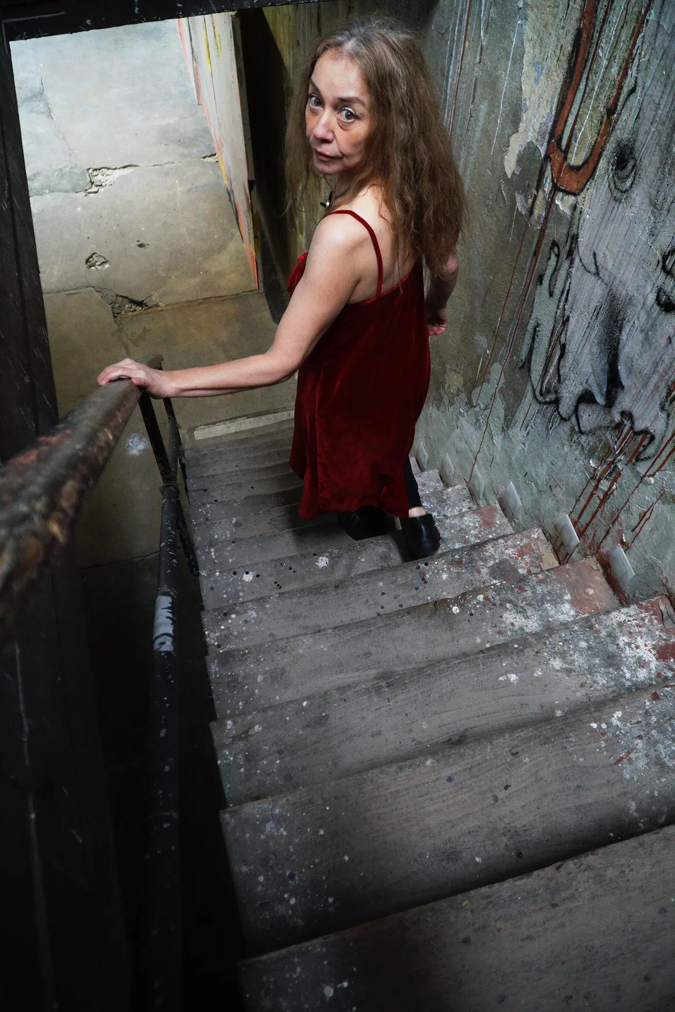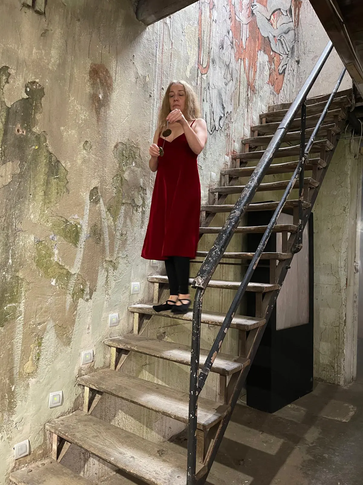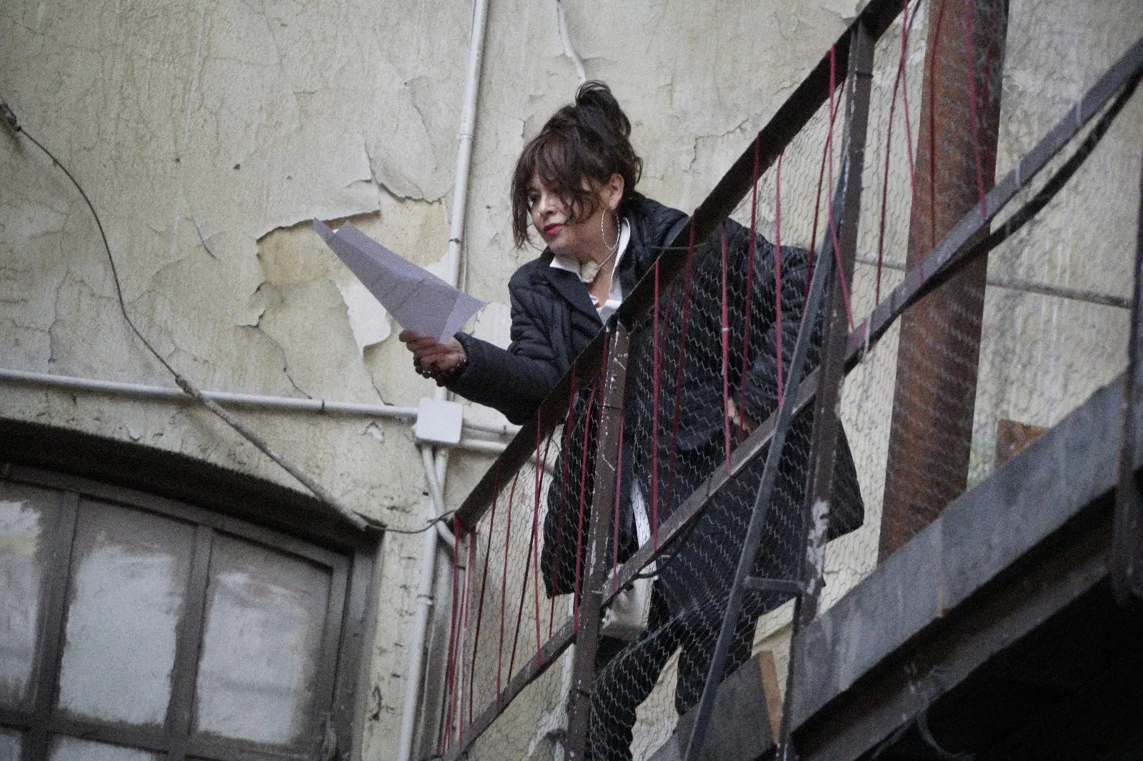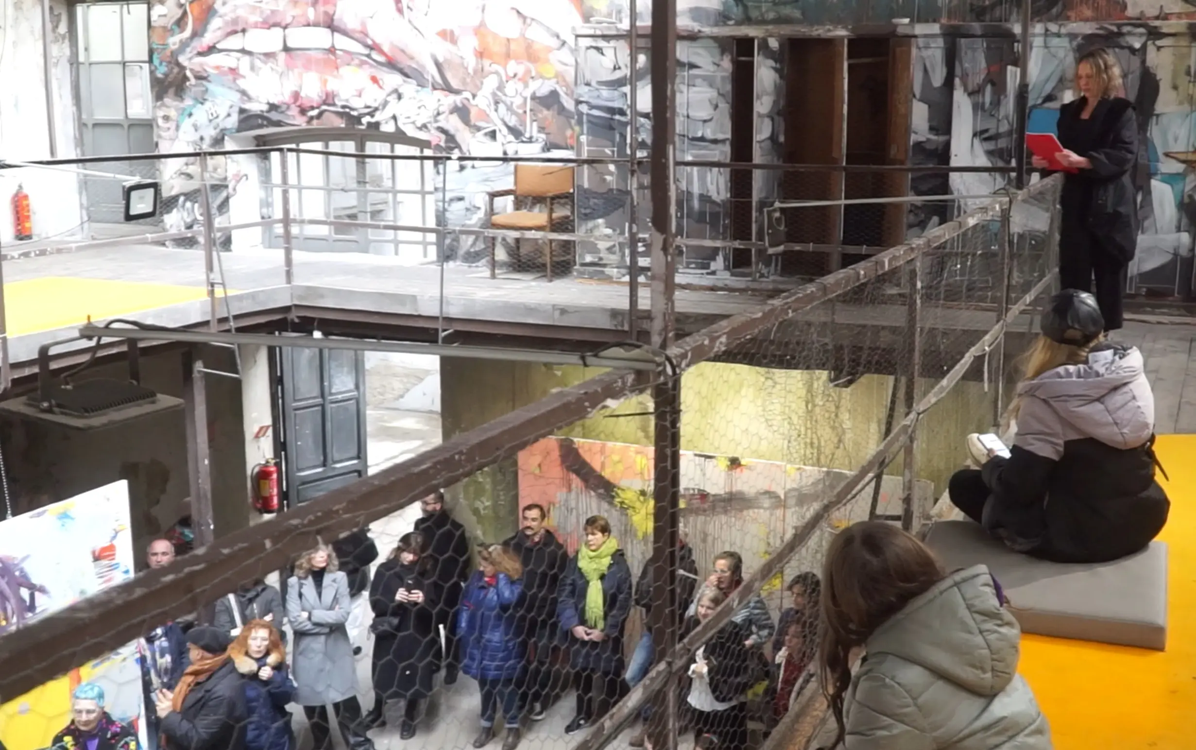 Anaís Ortega participating in the performance from the upper floor of the room.