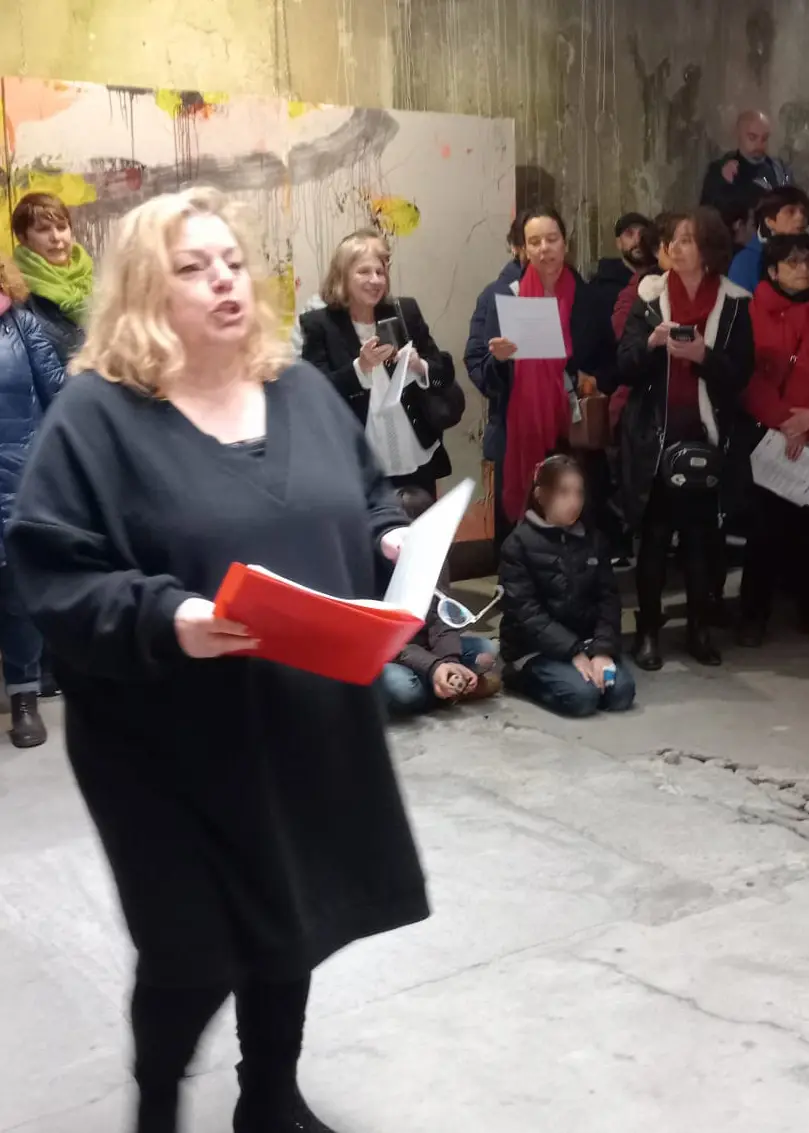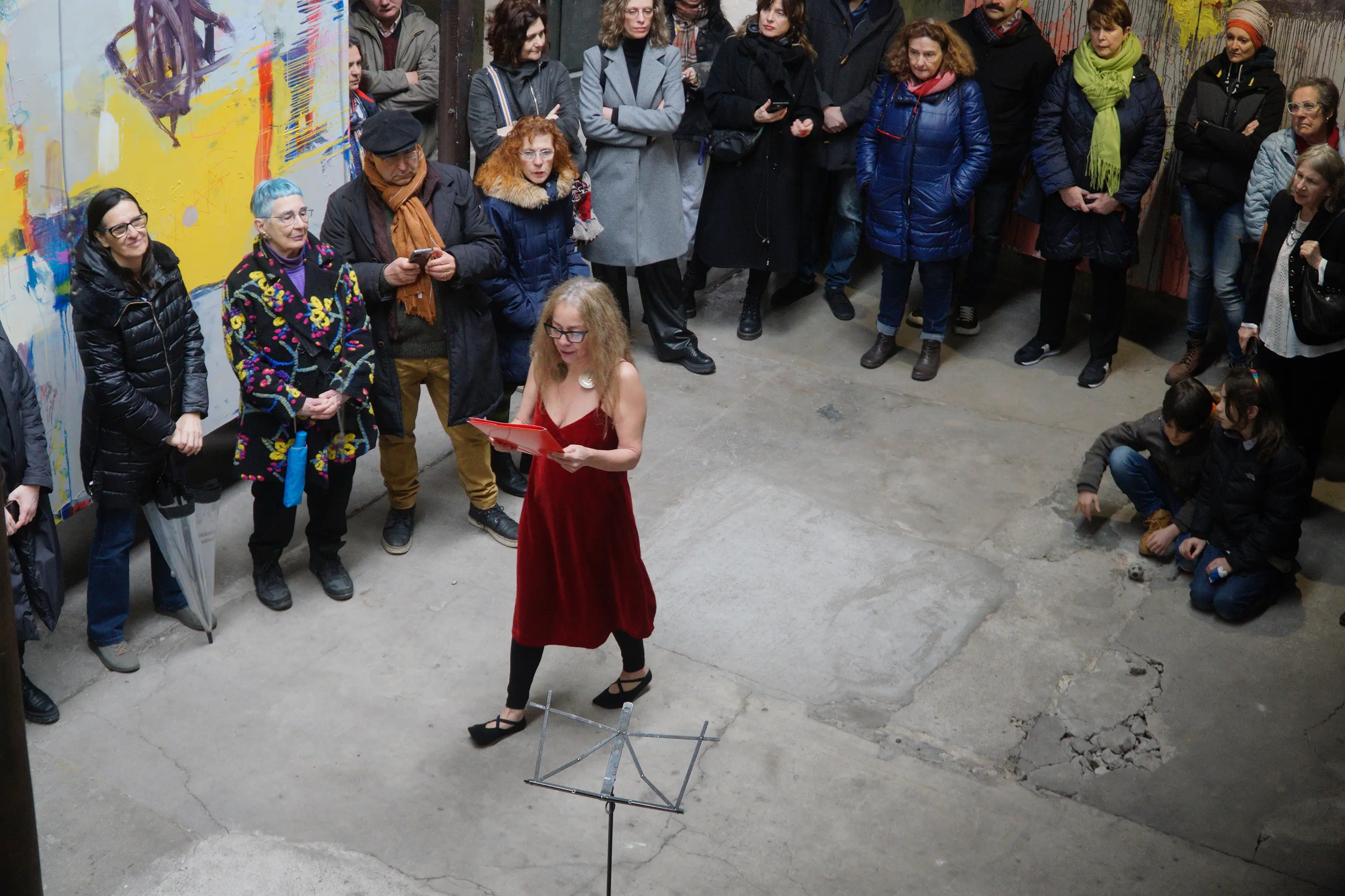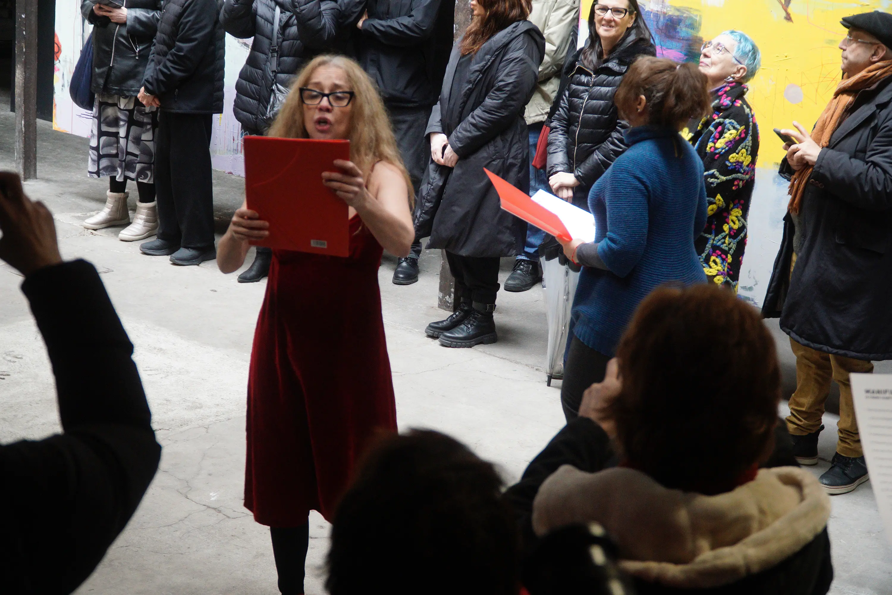 The reading began in a canonical fashion, with introductory guidelines. The four performers, once they had read it at least once, distributed it to the audience who, if they wished, could join in the reading.