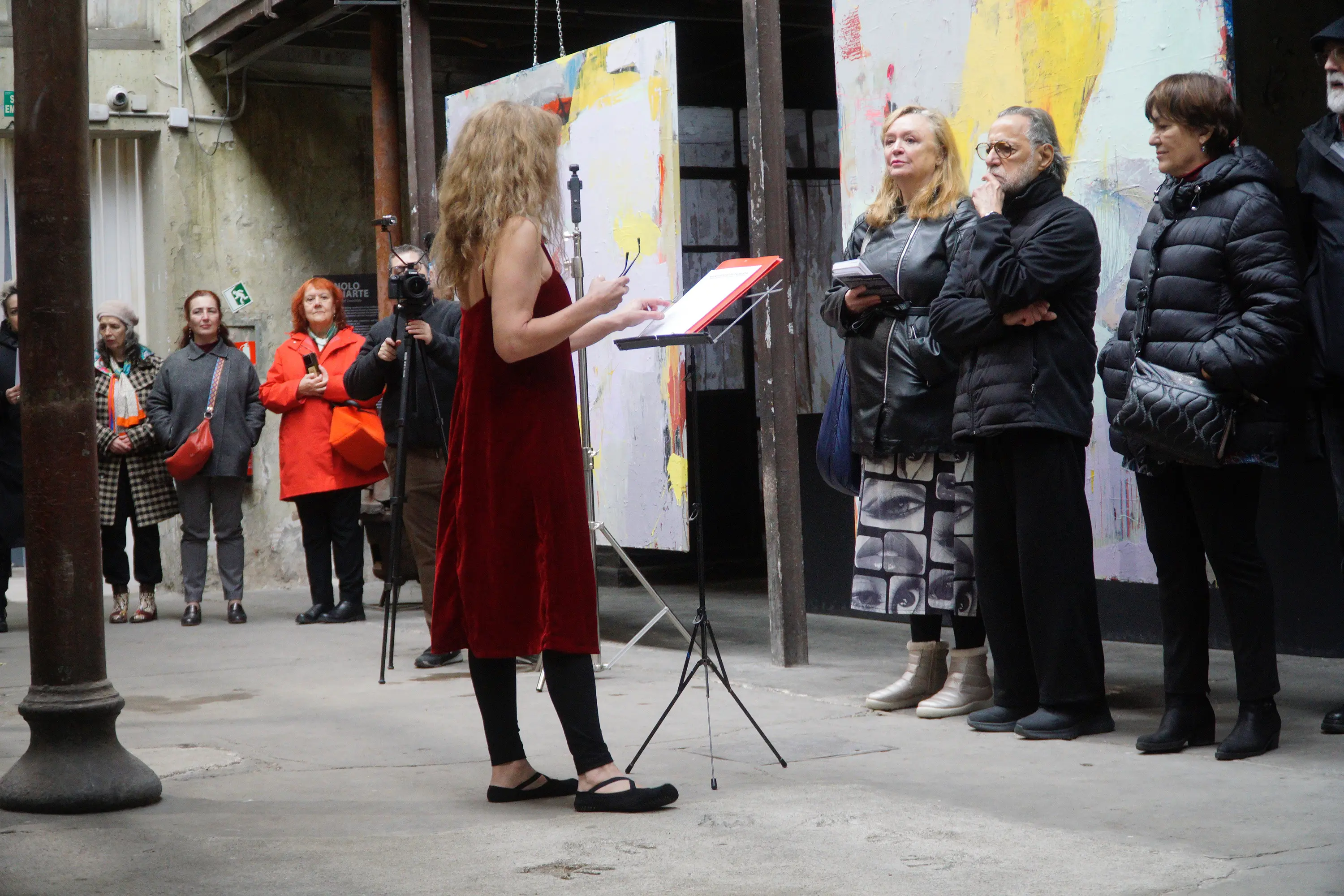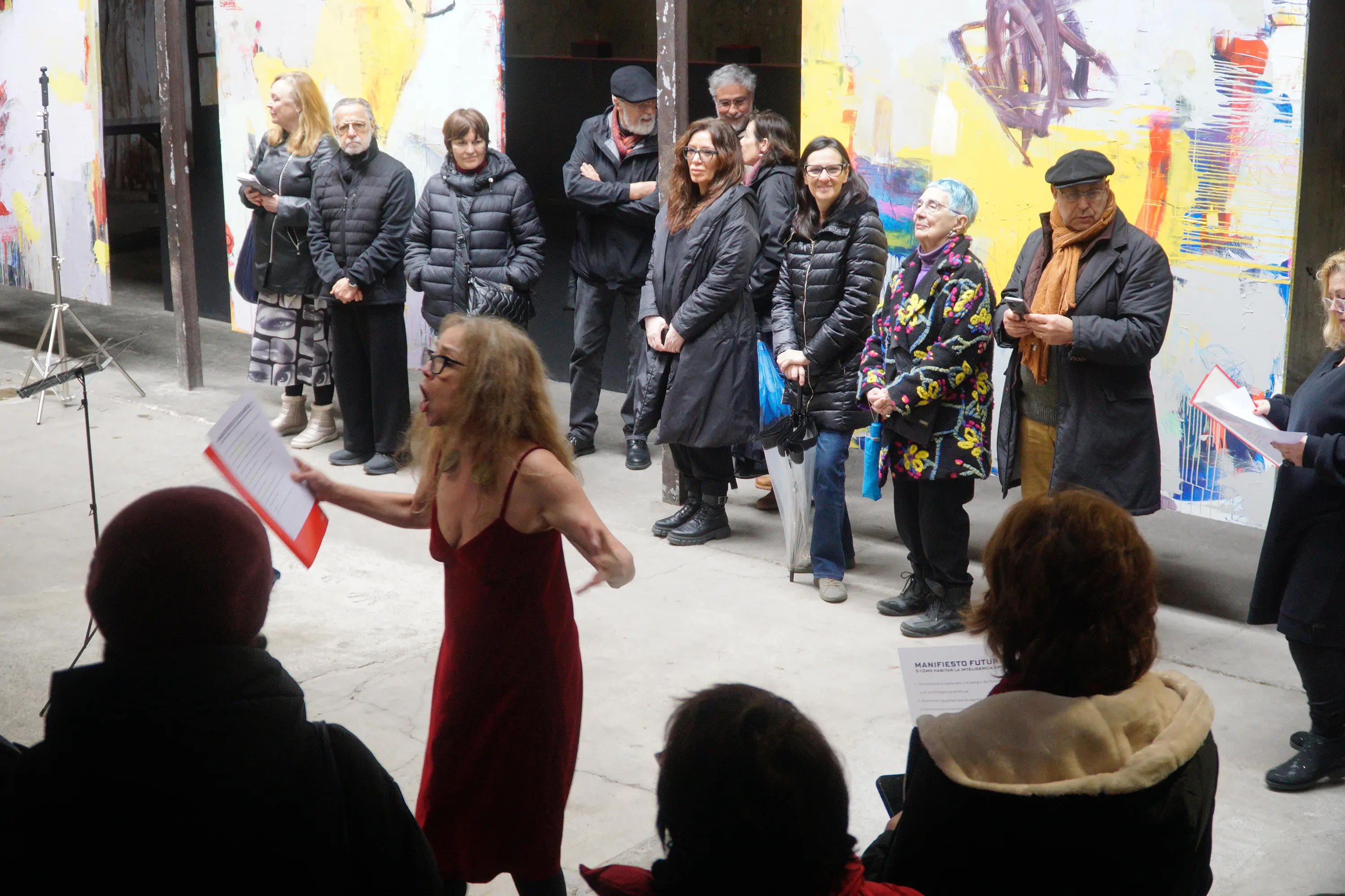 Upon arriving at the lectern in the center of the hall, she put on her finger cymbals and took out the document containing the manifesto. She read it first, and then the four performers who participated in the action alongside her. These artists were distributed throughout the hall: in different corners, two on the upper floor and two on the lower floor.