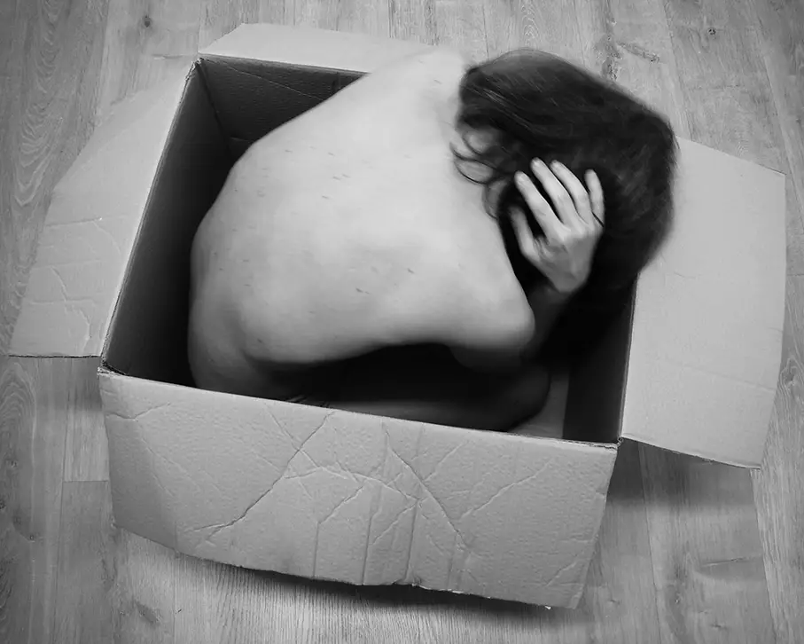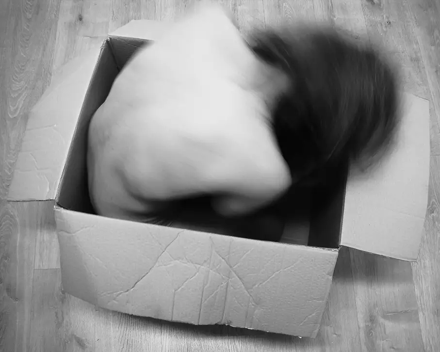 The cardboard box is identified with the house and conceals the woman until she decides to move and tear down this “cardboard ceiling”, a sticky ceiling of domestic space that must be shed without relinquishing the home as a liberating space. It is the woman who must fight to break free from all that society expects of her within a home simply for being a woman: caring for her husband, partner, children, the elderly, the house itself… and, against violence within the home (sexist, domestic, assaults…). The struggle ends when the body clears the cardboard lid and remains curled up in the fetal position inside the box, returning to the maternal womb, to the mother's home. A new relationship with domestic space is defined, a positive attitude toward the home, free and open to the outside world.